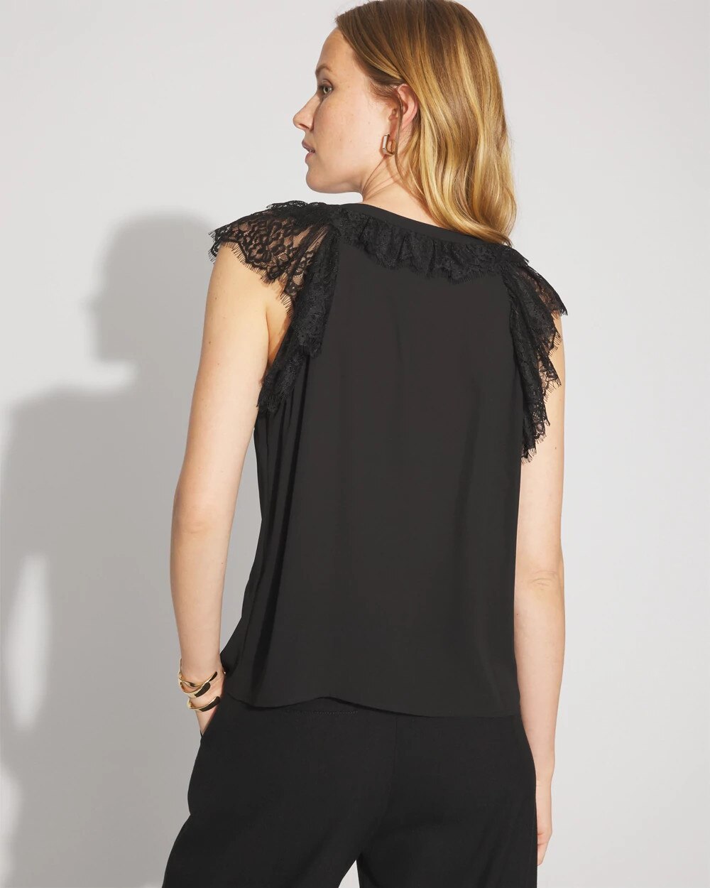 Feminine lace trims the flutter sleeves and the center front of this crepe fabric shell. The Y-neck has a tie-string which you can style as you choose. Wear under a blazer or on its own.