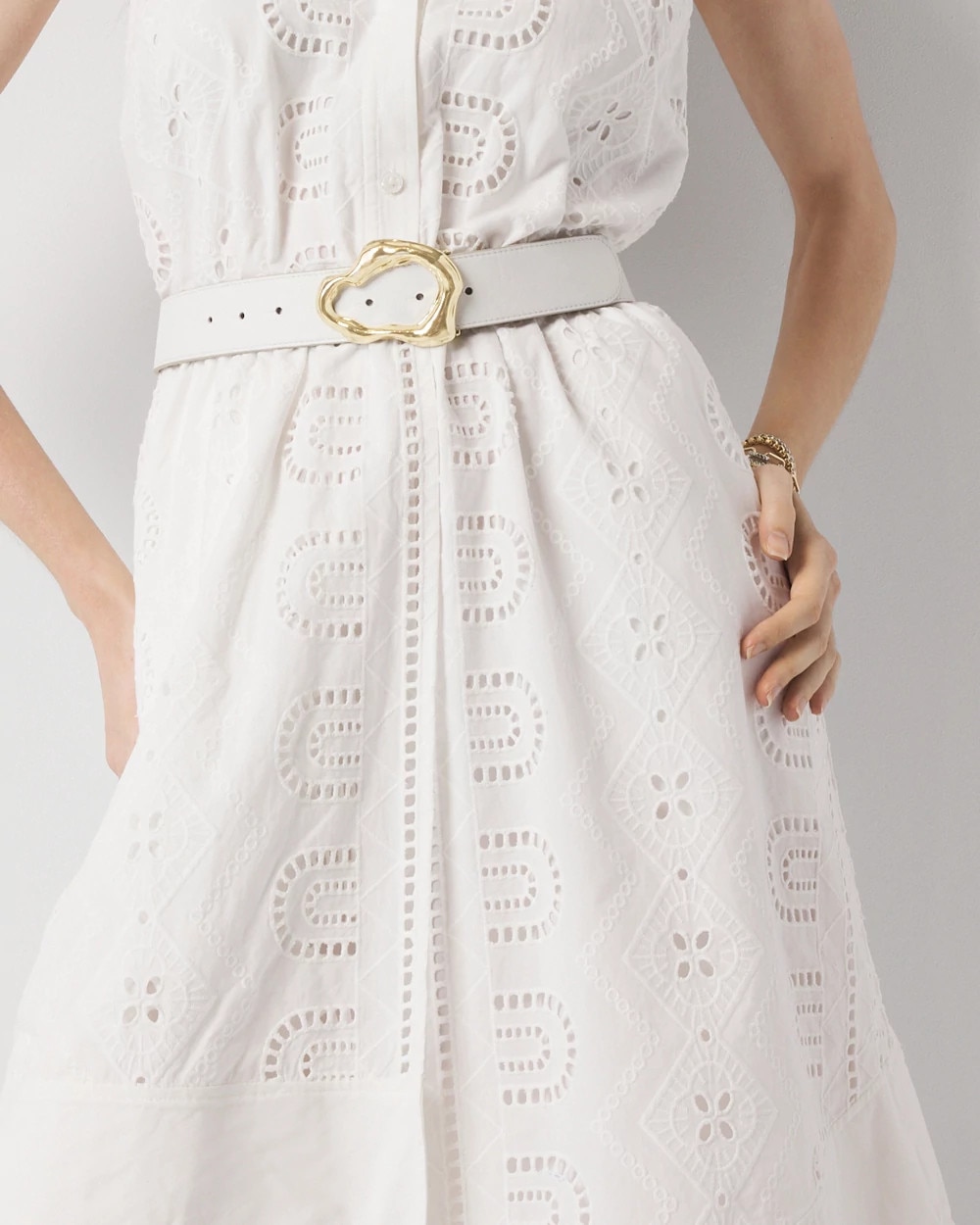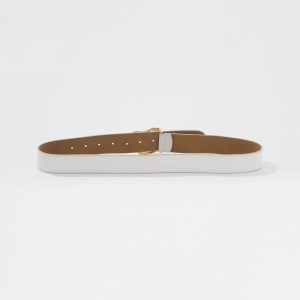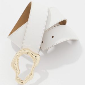 Instantly elevate your jeans or shorts with this ecru leather belt with a sculptural gold buckle. Also available in black with silver buckle.