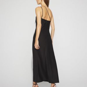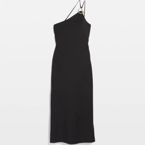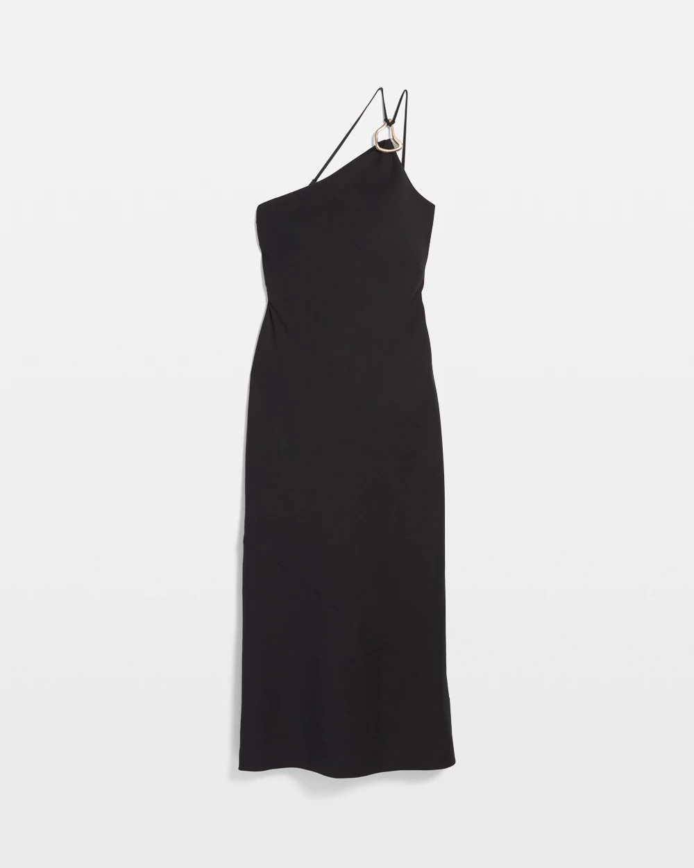 Reach for this one-shoulder column dress when you have somewhere special to be. Made from a linen-blend fabric, it has a soft gold sculptural hardware on the left shoulder where two straps attach. The straps also attach to two places in the back and are adjustable.