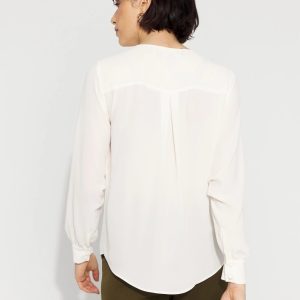Timeless + chic, this long-sleeve blouse is adorned with self-covered buttons. Made from a crepe fabric that gives you a stylish drape. An easy office-ready look.