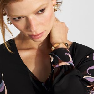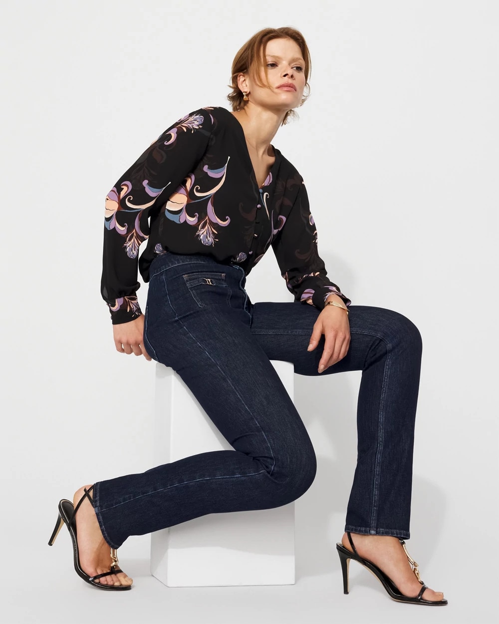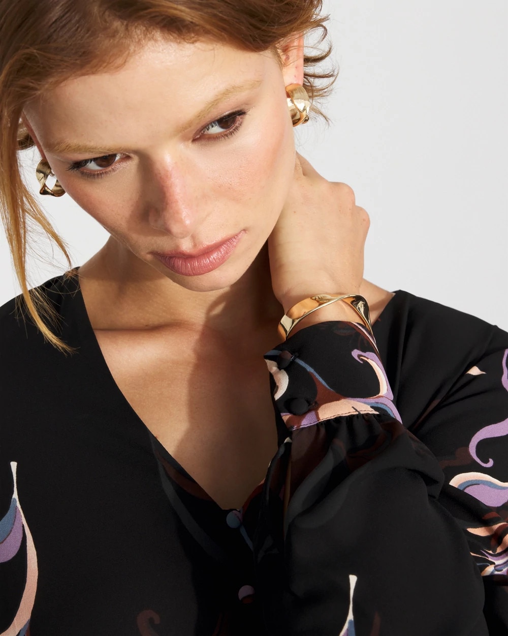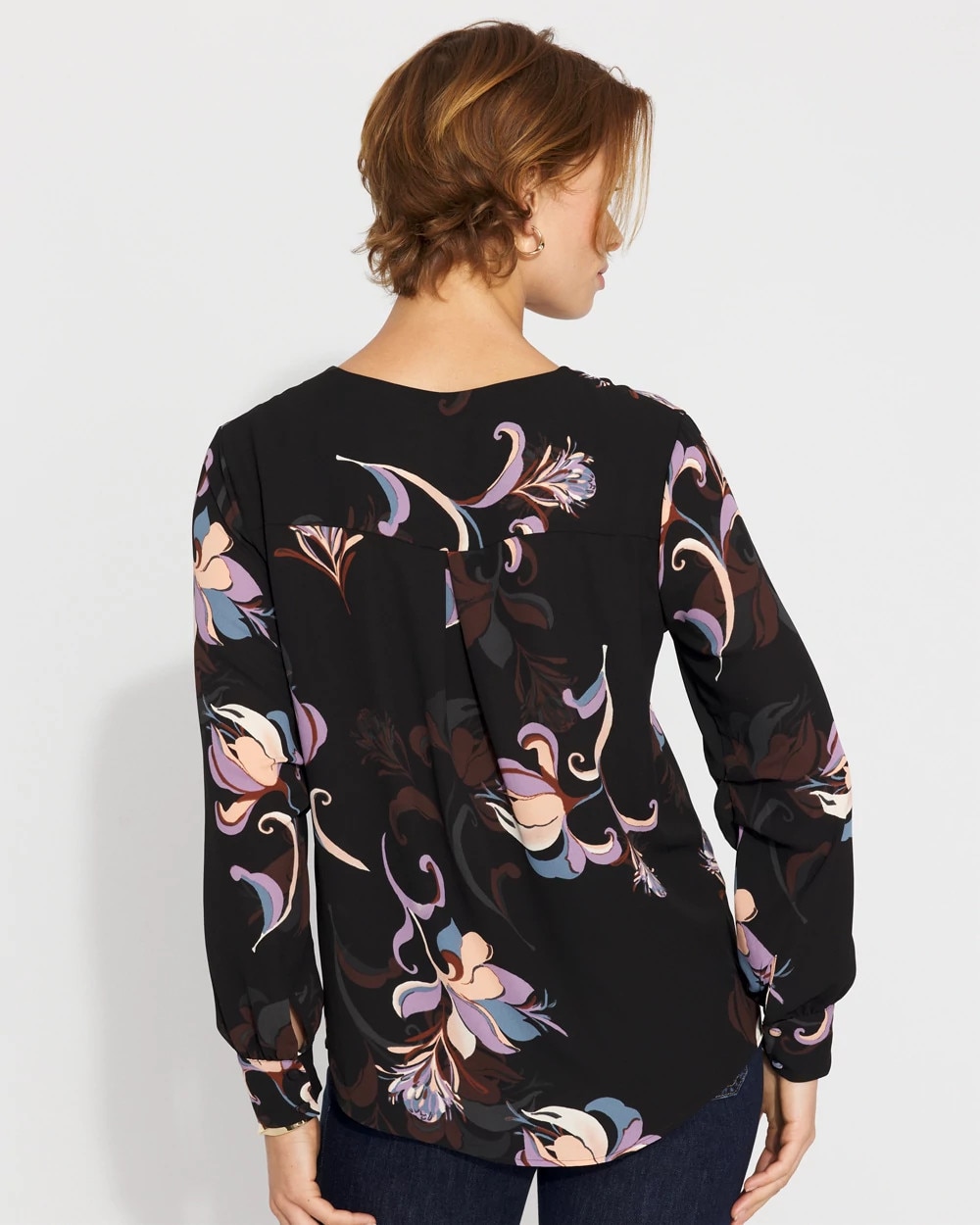 Timeless + chic, this long-sleeve blouse is adorned with self-covered buttons. Made from a crepe fabric that gives you a stylish drape. An easy office-ready look.
