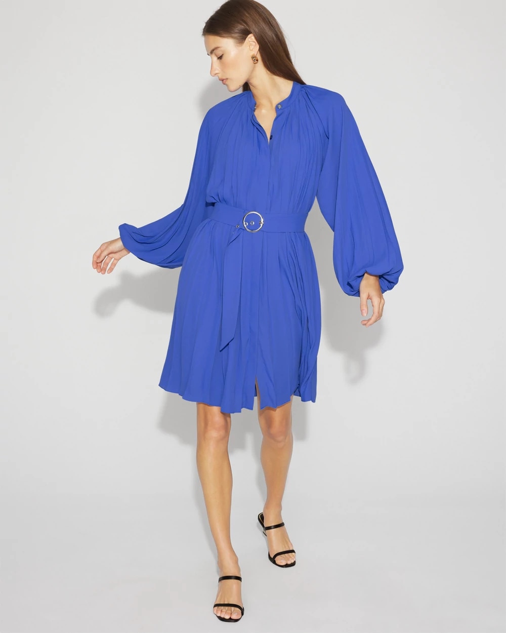 This easy work dress is designed with a front-button closure and a self-belt with grommets and hardware. The balloon sleeves with elastic cuffs and allover pleats give the look a feminine touch. Pair with your favorite heels or flats.