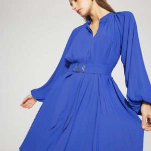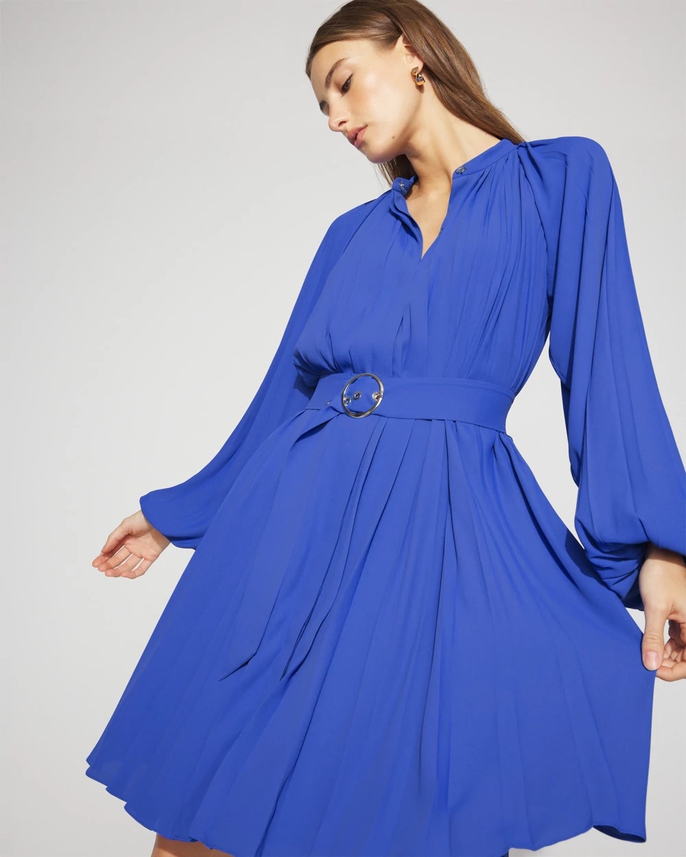 This easy work dress is designed with a front-button closure and a self-belt with grommets and hardware. The balloon sleeves with elastic cuffs and allover pleats give the look a feminine touch. Pair with your favorite heels or flats.