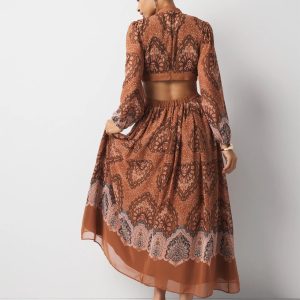 Long-Sleeve V-Neck Cutout Midi Dress