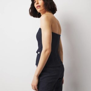 Our bustiers are designed to have a going-out vibe with a polished look. This bustier is a longer length and has an exposed zipper down the center front, as well as two pocket flaps with buttons. Boning inside the bodice provides structure to emphasis your feminine curves. This top has a washed denim look but is cut from a lightweight cotton-blend fabric with some stretch. Wear with matching WHBM® Two-Button Studio Blazer and High-Rise Straight Leg Pant.