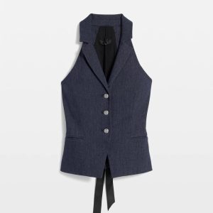 Crafted from a denim-look fabric, this vest has grosgrain ribbons that lace up at the back and are adjustable to customize fit. Faux pockets, three-button front closure and a notched lapel add a polished finish to the look. Pair with our matching Button Skort.