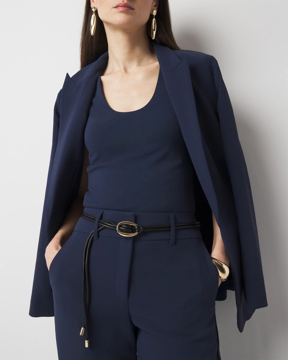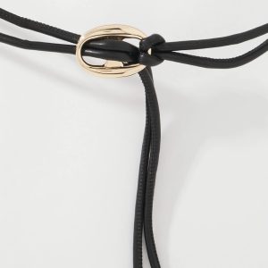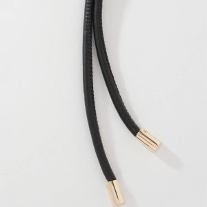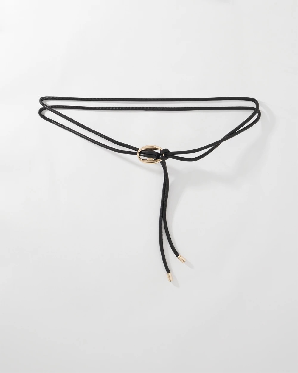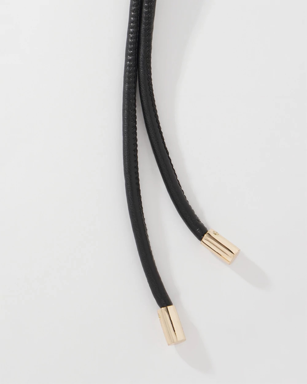 This faux leather obi belt self-ties, so you can style it as you wish. The black ties thread through a gold Mariner Link charm, a subtle nod to the on-trend nautical theme. The cord ends are also finished in gold. Pair it with other pieces in our Mariner Links Collection that includes jewelry and a sandal.