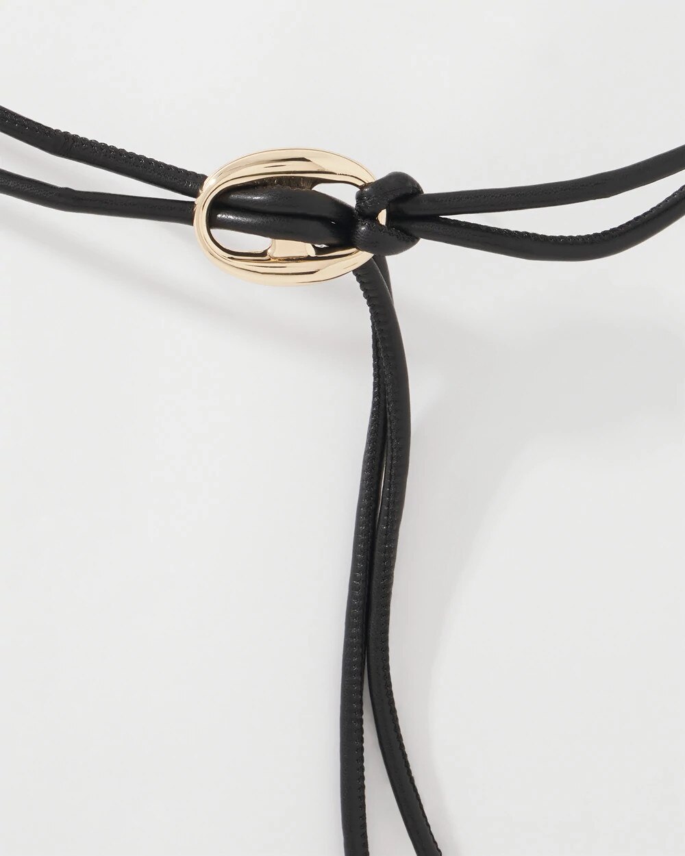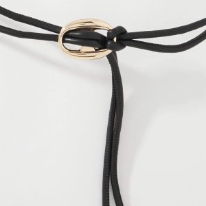 This faux leather obi belt self-ties, so you can style it as you wish. The black ties thread through a gold Mariner Link charm, a subtle nod to the on-trend nautical theme. The cord ends are also finished in gold. Pair it with other pieces in our Mariner Links Collection that includes jewelry and a sandal.