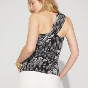 Made from a two-ply mesh fabric for sleek + full coverage, this one-shoulder top has soft shirring in the body and gel tape for support. The ikat print is perfect for the season.