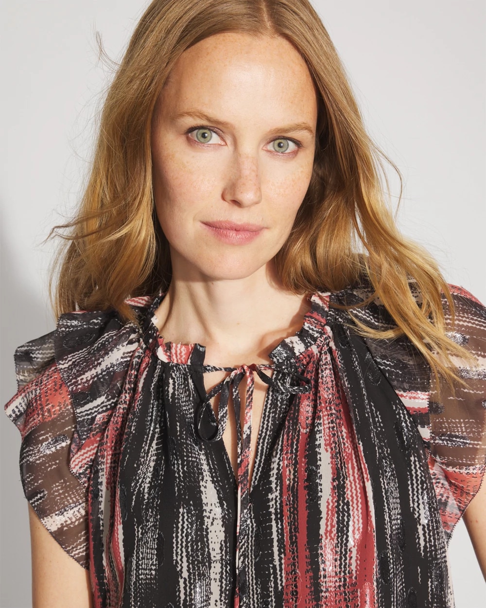 A sleeveless chiffon top with a metallic clip throughout the fabric to add subtle shimmer. The feminine flutter sleeves have a picot edge finish, and the ruffle neckline has a tie you can wear tied up or left open. A great top to layer under a blazer for work.