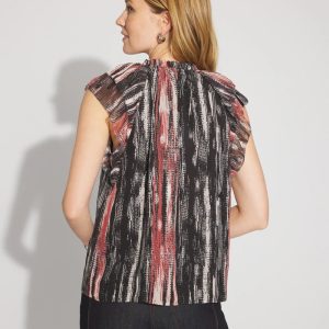 A sleeveless chiffon top with a metallic clip throughout the fabric to add subtle shimmer. The feminine flutter sleeves have a picot edge finish, and the ruffle neckline has a tie you can wear tied up or left open. A great top to layer under a blazer for work.