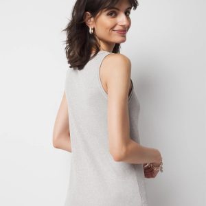 This metallic knit tank has knotted details that split over the shoulder. A relaxed yet elevated tee that will dress up your denim or shorts.
