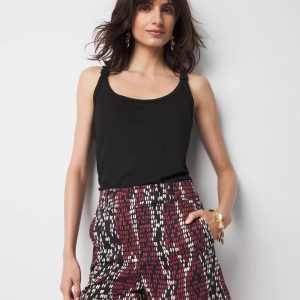This metallic knit tank has knotted details that split over the shoulder. A relaxed yet elevated tee that will dress up your denim or shorts.