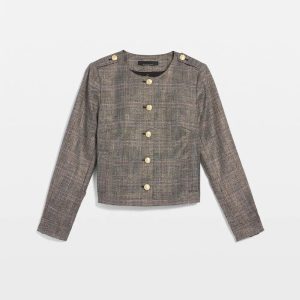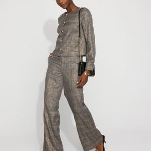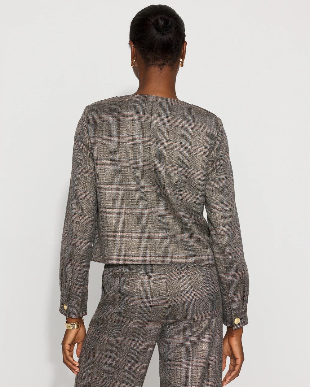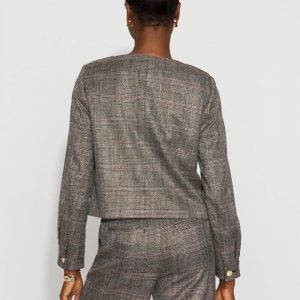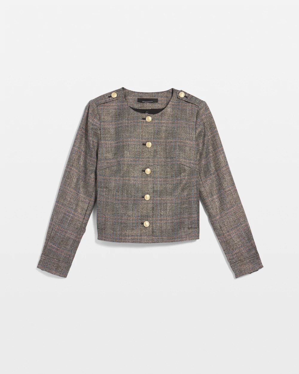 Classic plaid gets a subtle dose of shine thanks to metallic thread, giving this jacket a modern look. We designed it to be slightly cropped with a round collar, epaulets and gold crest buttons down the front and at the cuffs. Pair it with our matching Metallic Plaid Wide-Leg Pant.