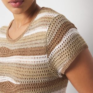 Lurex yarn gives shine to wavy stripes in this crewneck tee. An easy way to dress up denim or shorts.