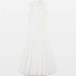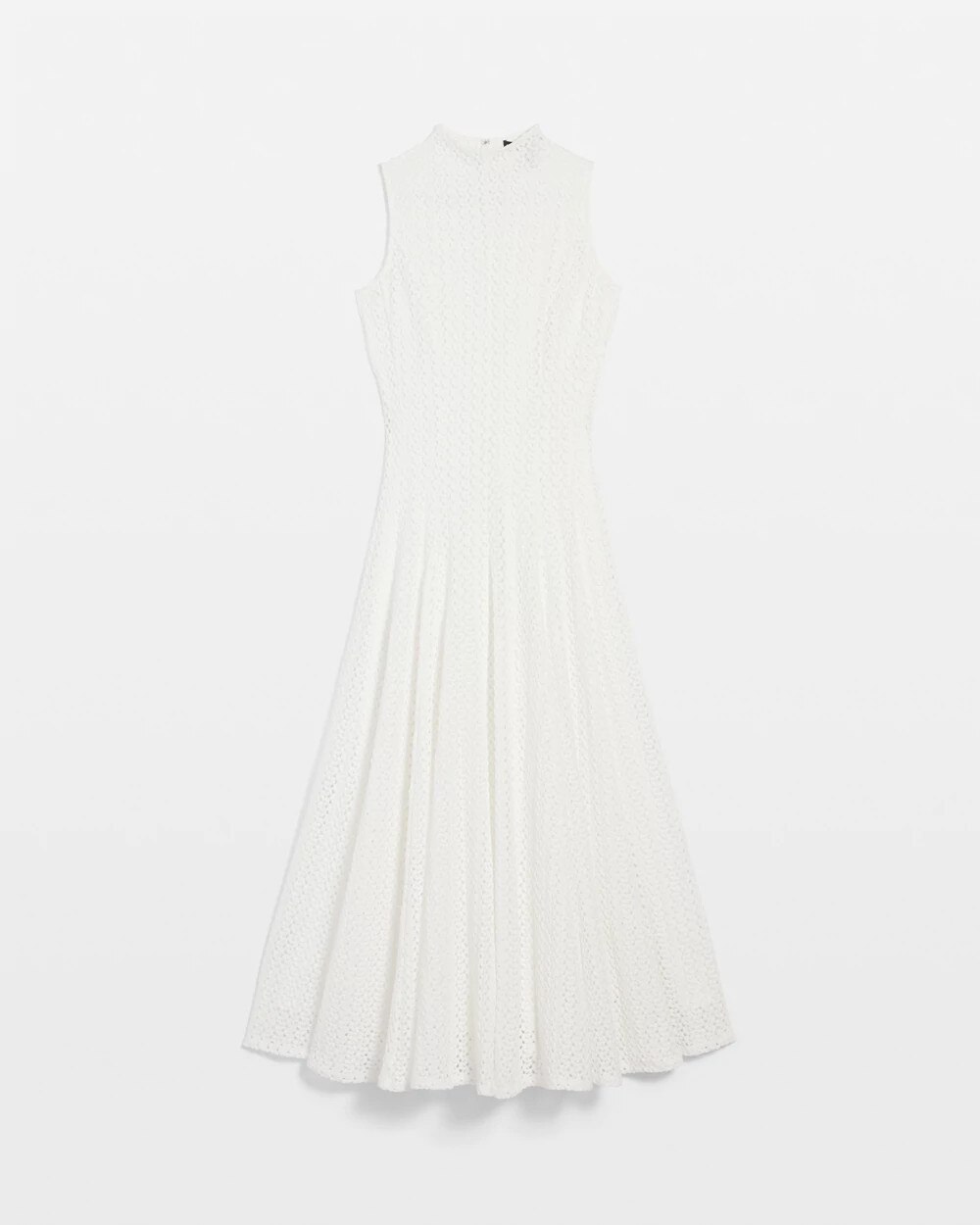 Crafted from a soft, stretchy knit lace, this midi dress is designed with a modern mock neck and a godet pleated skirt for fullness. A look that’s form-fitting + feminine and can easily go to brunch or dinner.