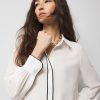 A twist detail creates a draped effect on one shoulder of this satin mock neck blouse. Three-buttons do up at the back of the neck and on the cuffs. A subtle jacquard stripe adds texture, and soft shirring at the shoulder soften the look. This is a chic look for the office when paired with black pants or trousers.