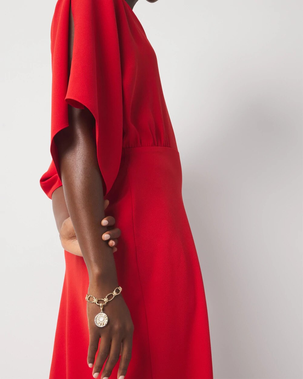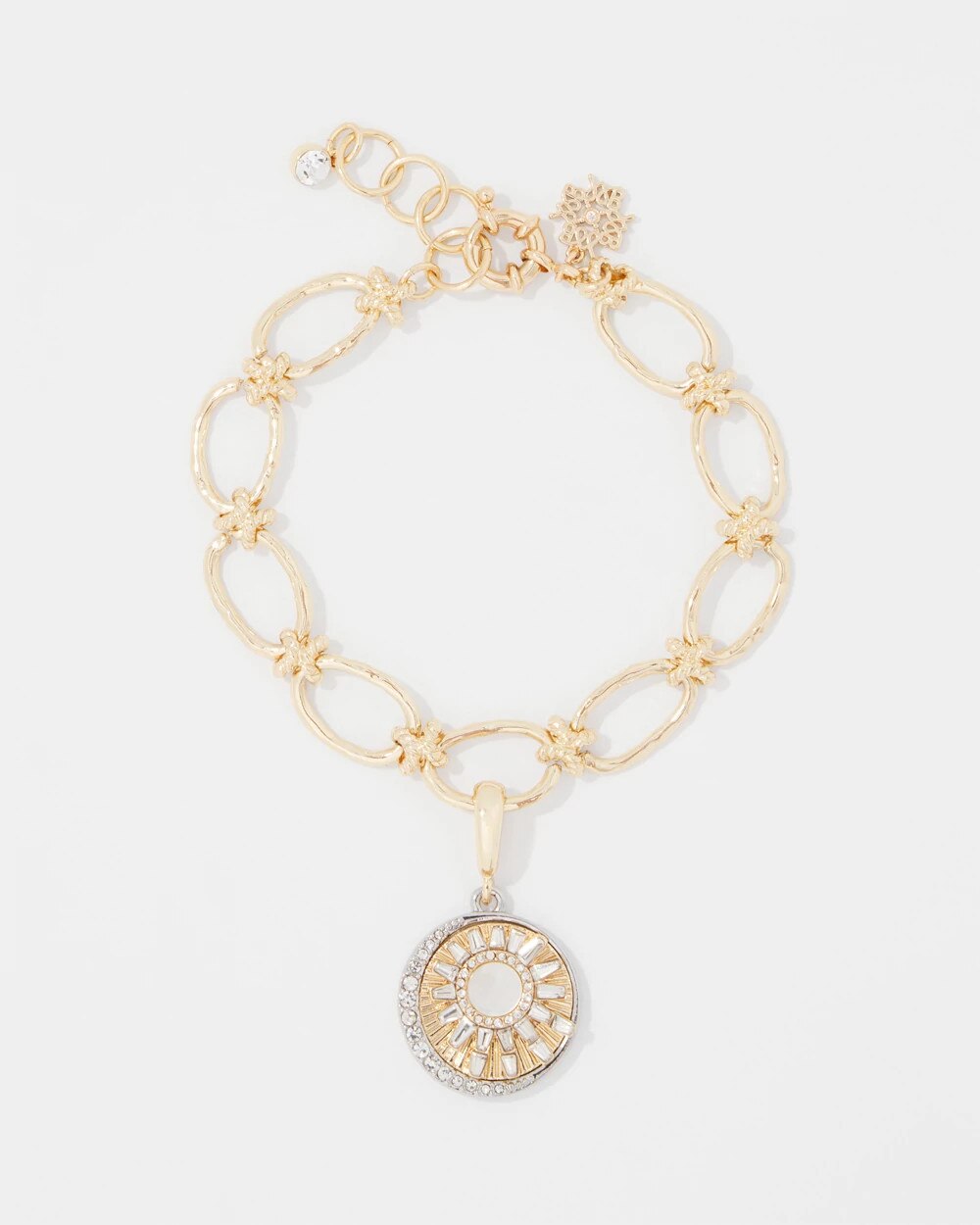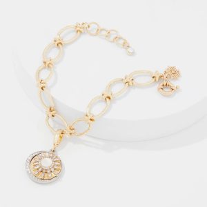 Gold-plated oval links and knots form the chain on this charm bracelet. The single mother of pearl disc charm has an abstract sunburst shape that’s perfect for hot summer days and nights.