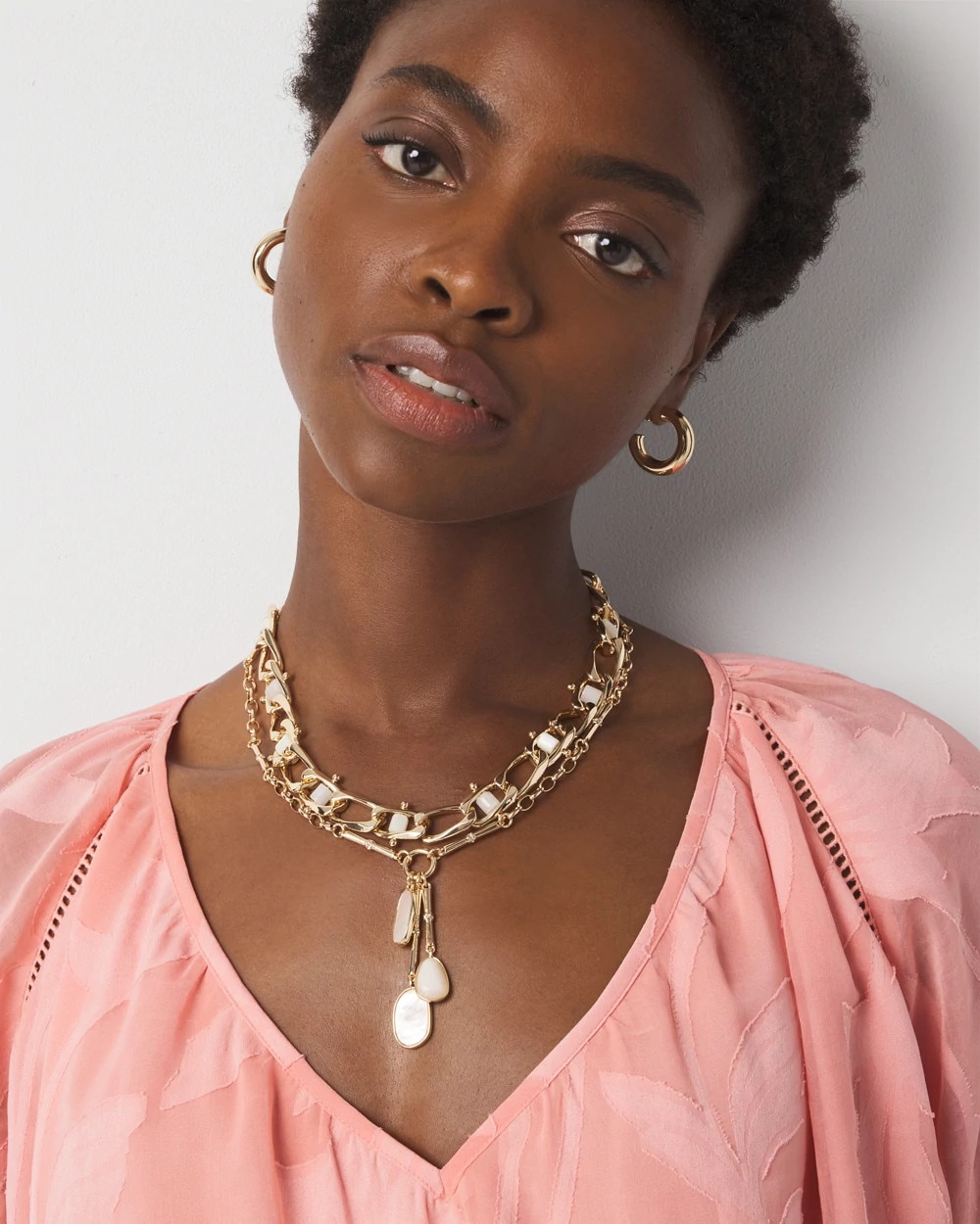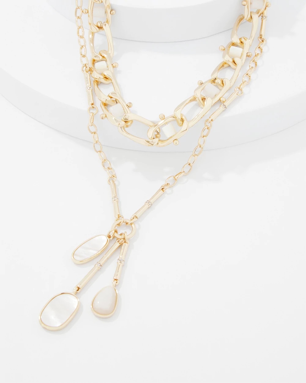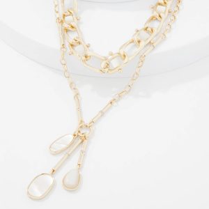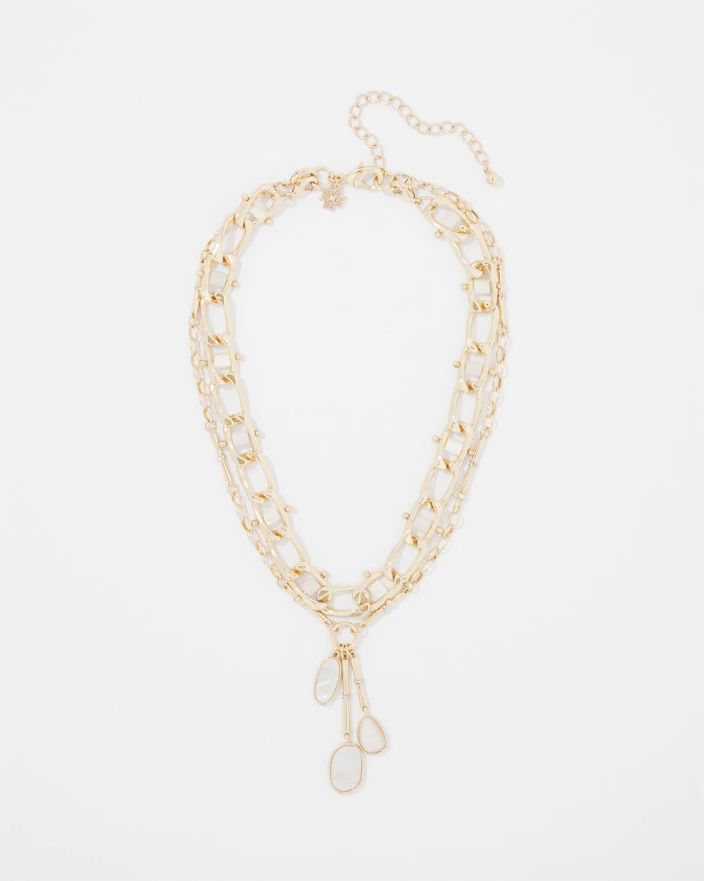 Add shine to your summer wardrobe with this gold multi-strand necklace with mother of pearl rollers and charms. Mix and match with other pieces in the Mother of Pearl Collection.