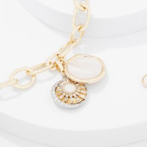 A mother of pearl disc rimmed in gold plate and an abstract sunburst charm are suspended from a large link chain. A simple, clean look that will elevate everyday tees or dresses.