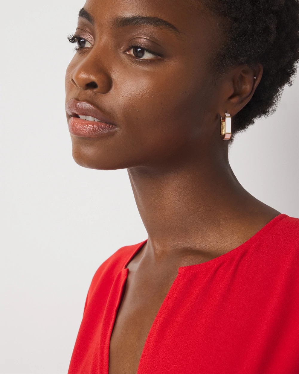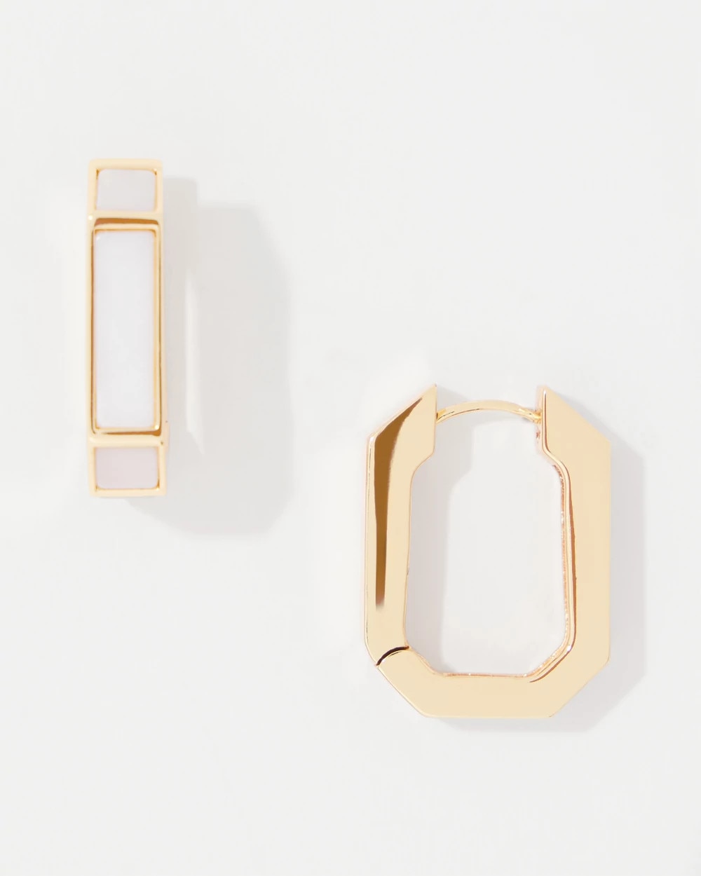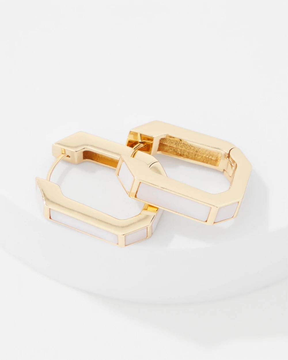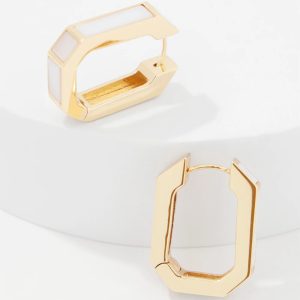 These huggie hoop earrings are inlaid with mother of pearl for an iridescent and pretty look. Pair with matching mother of pearl cuff bracelet.