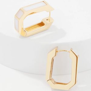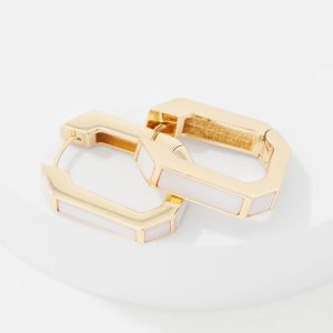These huggie hoop earrings are inlaid with mother of pearl for an iridescent and pretty look. Pair with matching mother of pearl cuff bracelet.