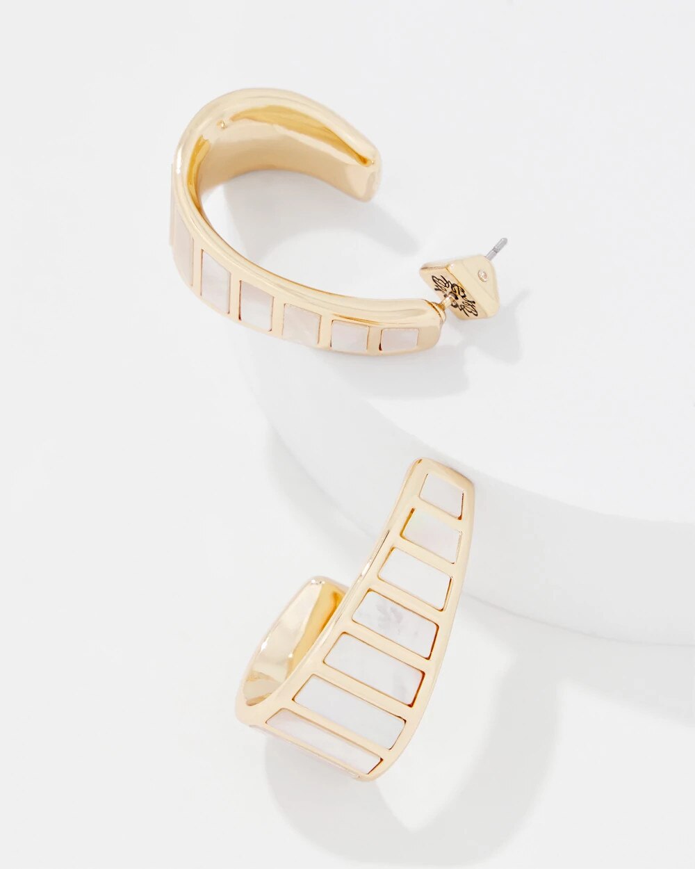 Iridescent mother of pearl is framed by gold-plated ladder trim for a stunning yet simple hoop.