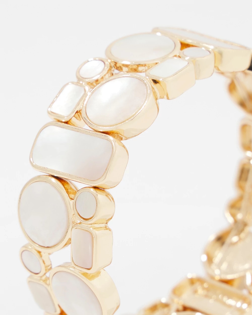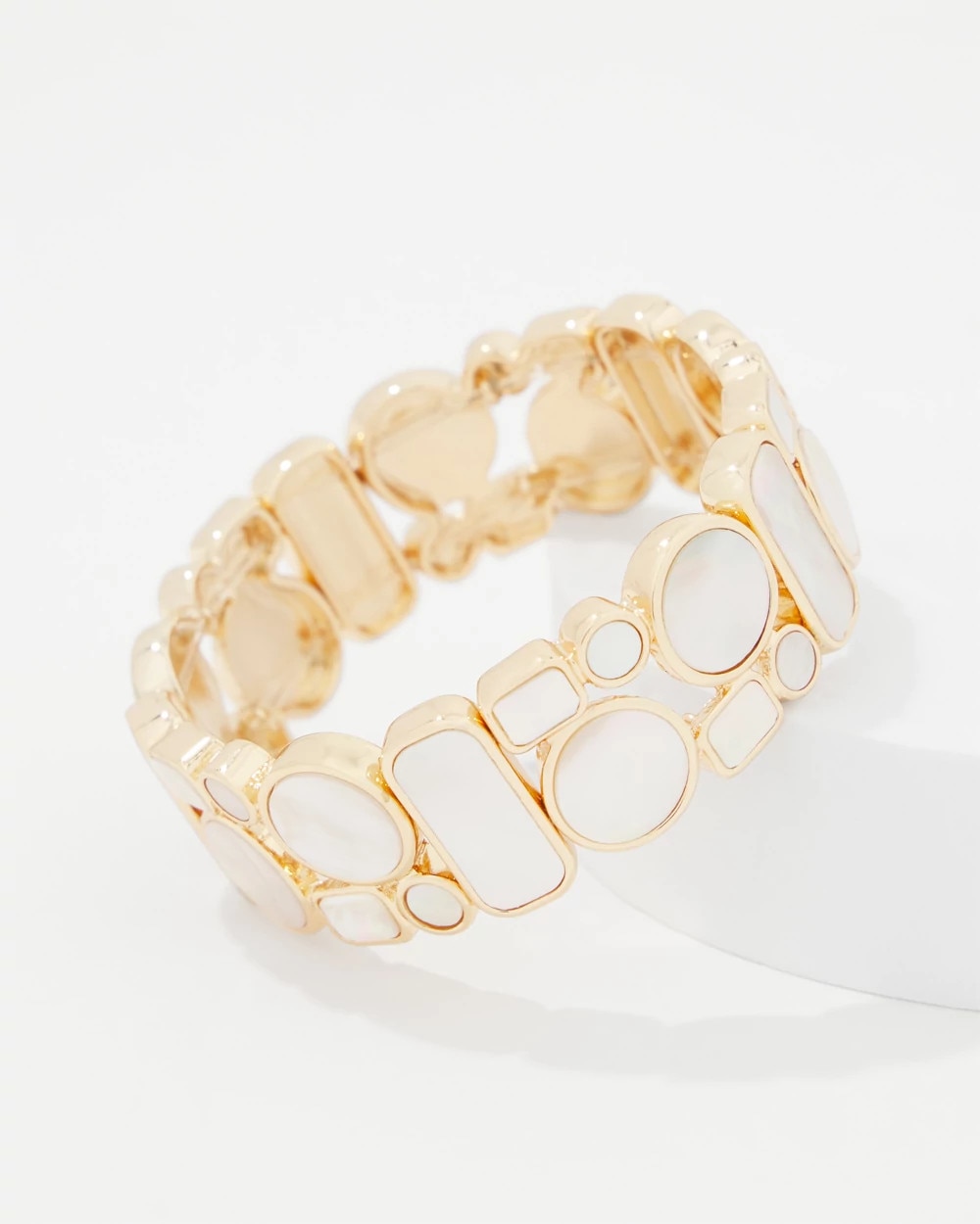 This stretch bracelet is designed with mother of pearl and gold-plate for a timeless look.