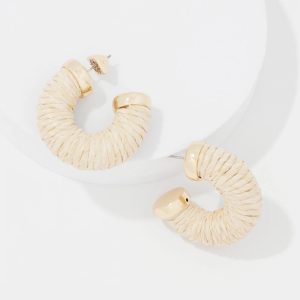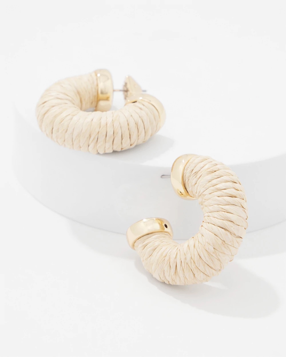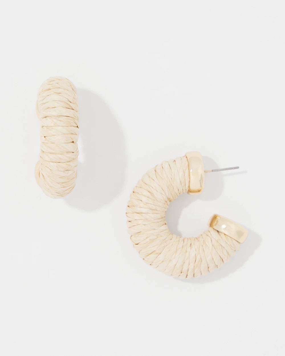 These timeless hoop earrings are wrapped in natural raffia, a material long associated with summer fashion. Pair with its matching necklace and bracelet.