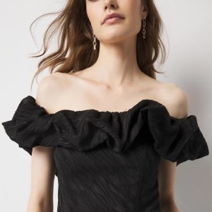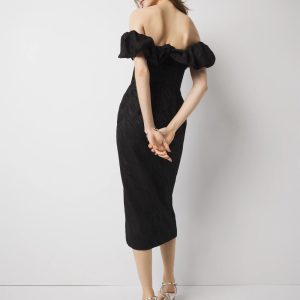 We’ve given this LBD maximum impact by added volume to the off-the-shoulder neckline as well as bustier construction with boning and corset seams in the bodice. The skirt has a side slit to show some leg. The jacquard fabric has a lux texture that makes this midi dress a special occasion choice.