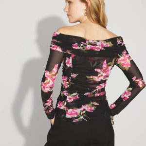 Soft shirring at the princess seams and an off-the-shoulder design combine to create a feminine take on the going-out top. With a slightly sheer mesh fabric, the print is a stand-out for pairing with black pants or jeans.