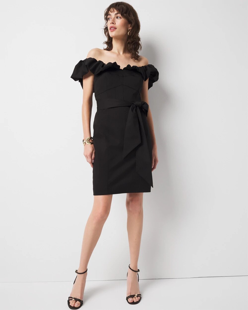 This off-the-shoulder dress is made from a cotton and lyocell blend. The bodice is designed with boning in front and back seams with an invisible center back zipper. Style with sleeves off or on the shoulder.
