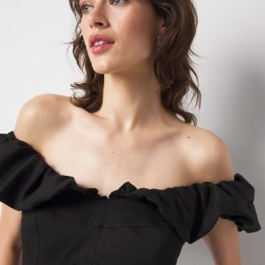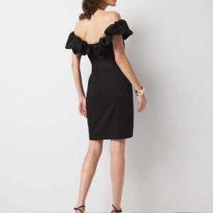 This off-the-shoulder dress is made from a cotton and lyocell blend. The bodice is designed with boning in front and back seams with an invisible center back zipper. Style with sleeves off or on the shoulder.