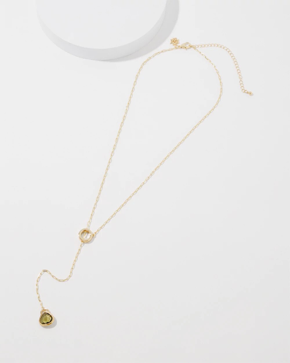 This Y necklace is a study in simplicity. A large 18mm, nearly ¾ of an inch, glass stone in an olive shade hangs from a delicate gold chain to instantly elevate tops and dresses. Pair with other pieces from the Olive Group Collection.