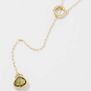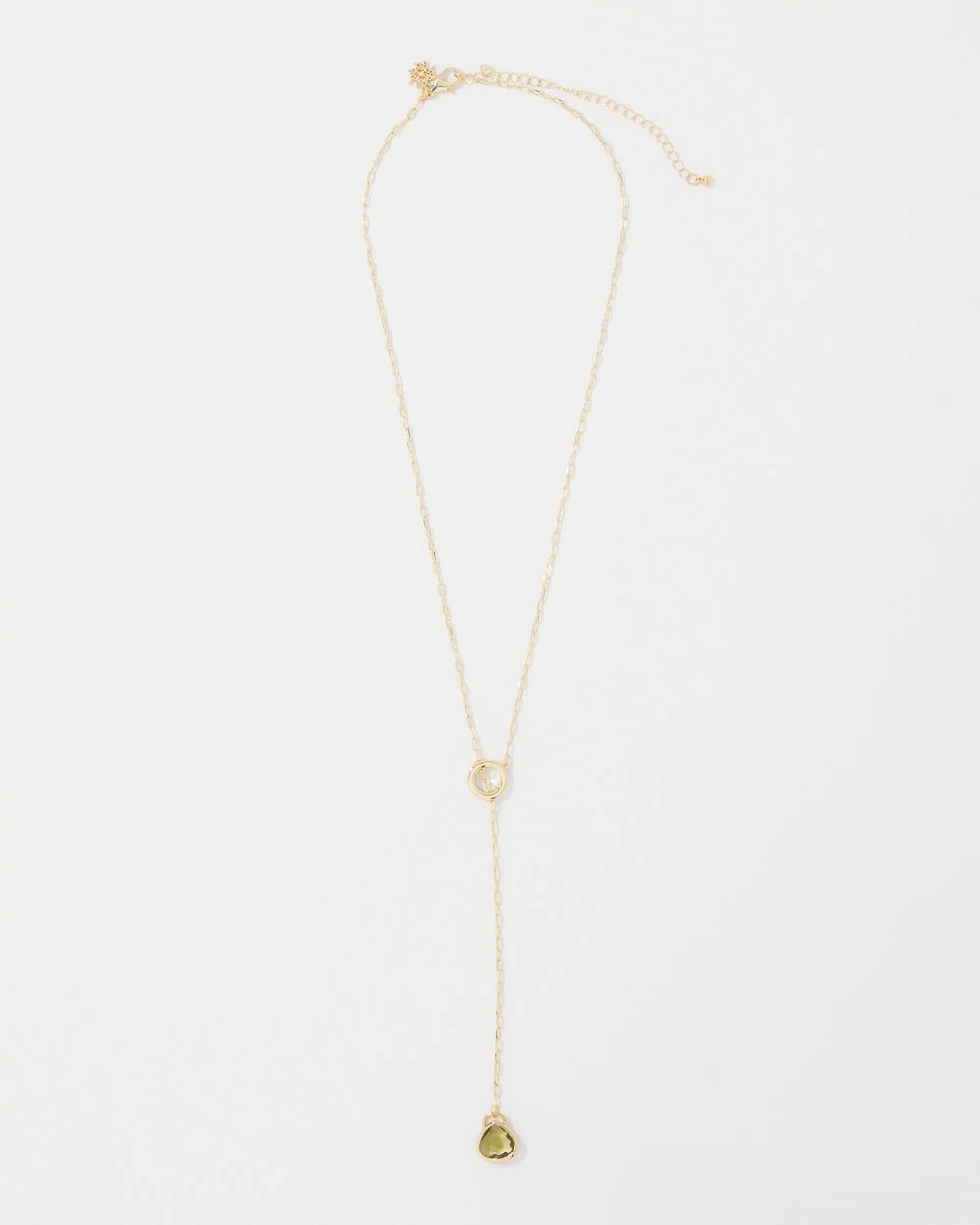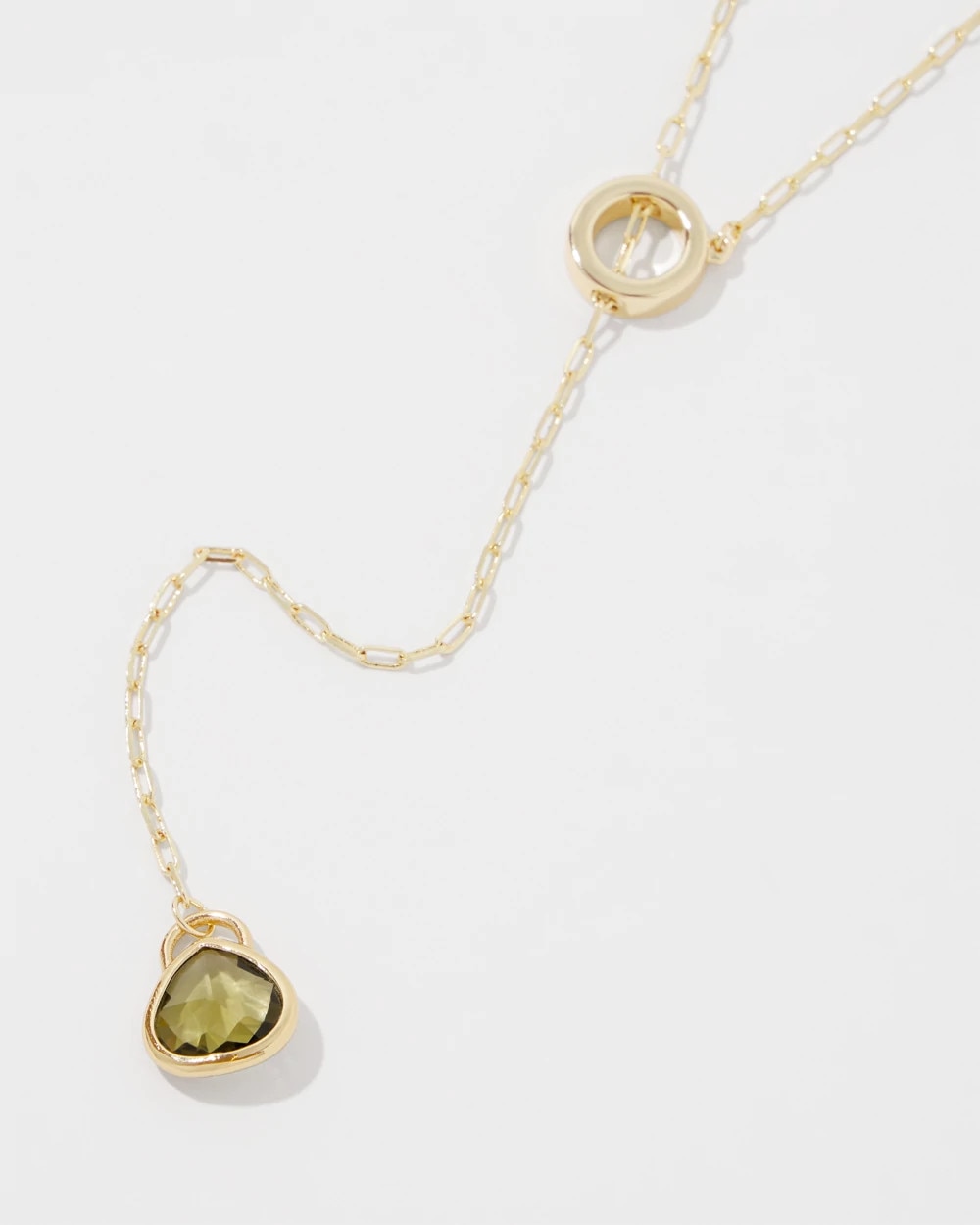 This Y necklace is a study in simplicity. A large 18mm, nearly ¾ of an inch, glass stone in an olive shade hangs from a delicate gold chain to instantly elevate tops and dresses. Pair with other pieces from the Olive Group Collection.