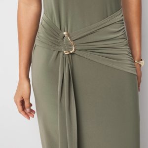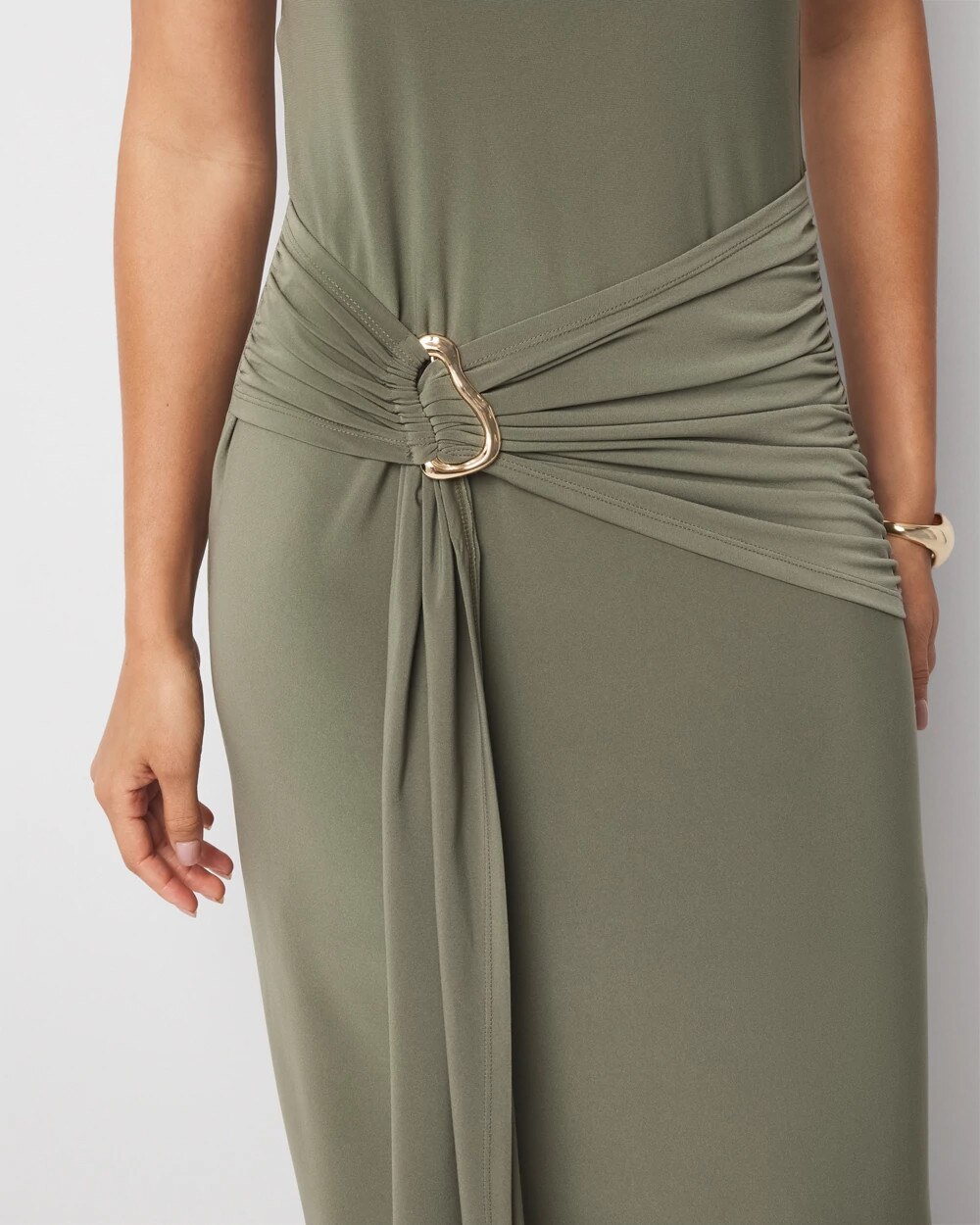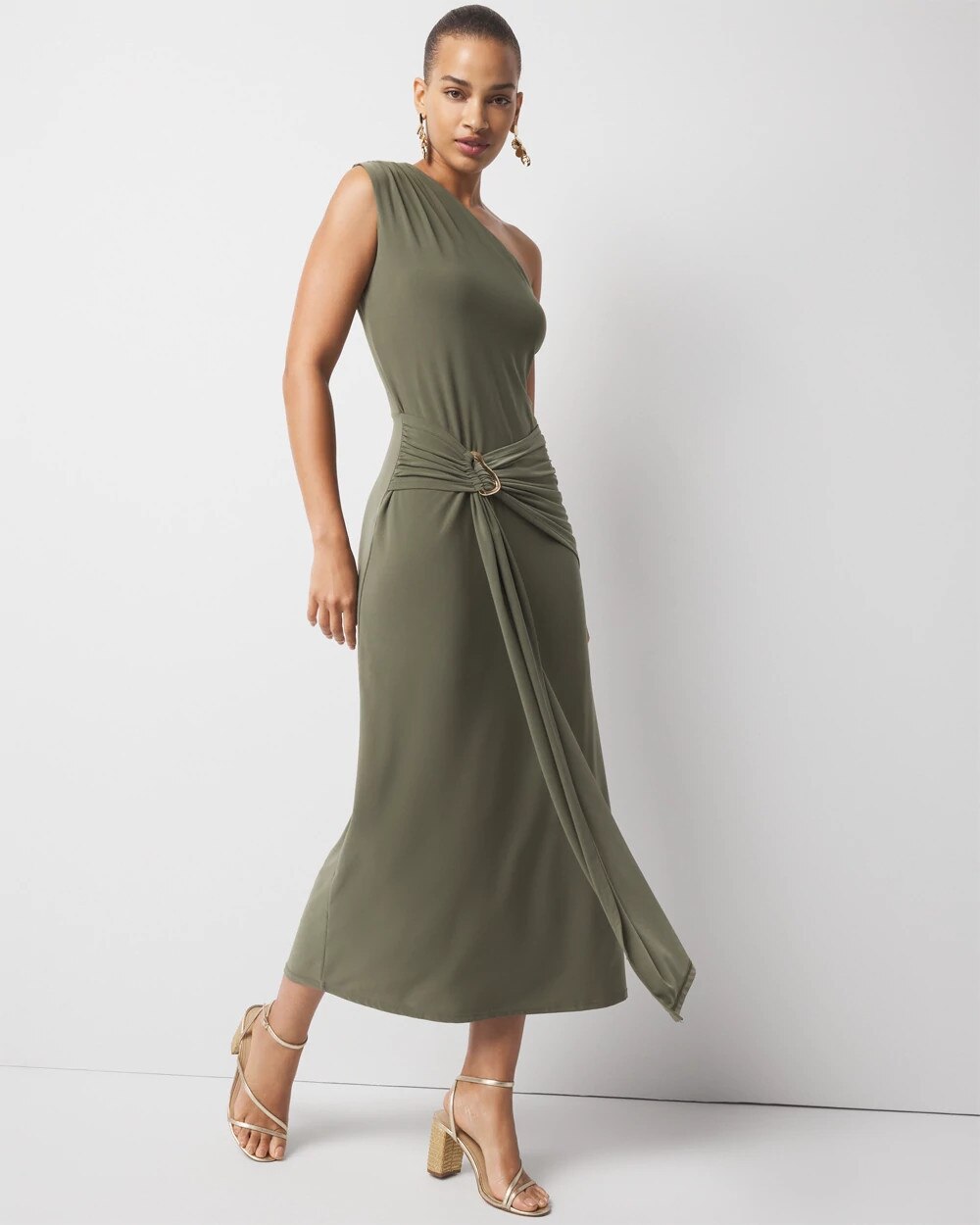 Made from soft matte jersey which has a flattering drape quality, this one-shoulder dress has an attached tie at the waist with a sculptural buckle that you can adjust. A simple, clean look for parties and events.