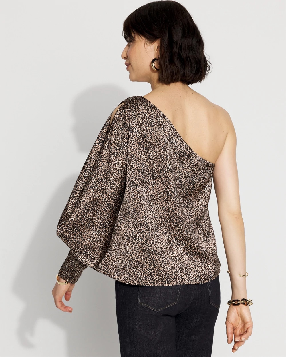 Instantly add drama to black pants or denim with this one-shoulder satin blouse. An asymmetric neckline bares one shoulder, while the draped sleeve has a cutout to allow some skin to peek through.