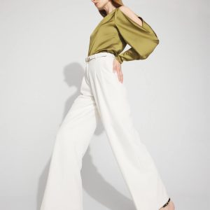Instantly add drama to black pants or denim with this one-shoulder satin blouse. An asymmetric neckline bares one shoulder, while the draped sleeve has a cutout to allow some skin to peek through.