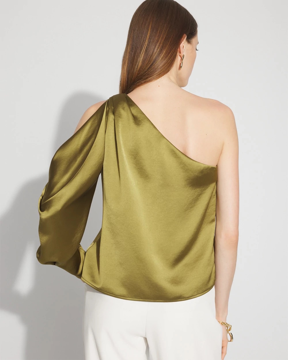 Instantly add drama to black pants or denim with this one-shoulder satin blouse. An asymmetric neckline bares one shoulder, while the draped sleeve has a cutout to allow some skin to peek through.