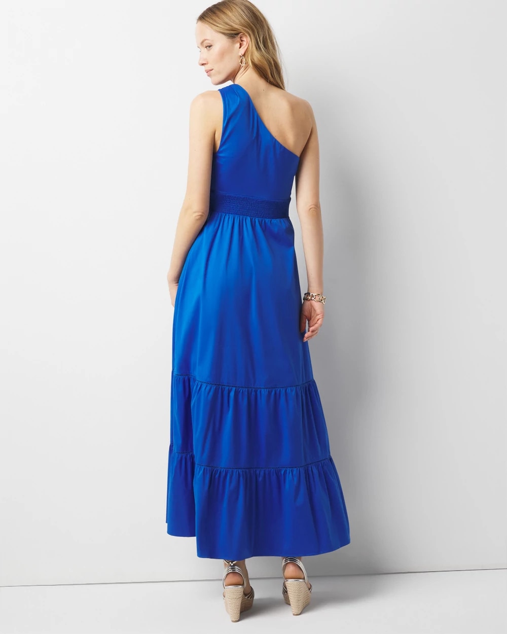 There’s a lot going on with this maxi dress. We’ve designed it with a one-shoulder twist look and a sly cutout at above the waist and a full skirt. Made from cotton poplin, it’s a bold party look for the season.