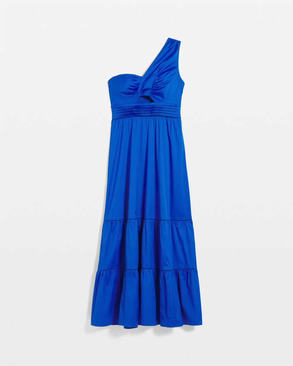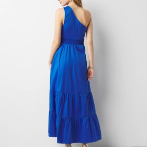 There’s a lot going on with this maxi dress. We’ve designed it with a one-shoulder twist look and a sly cutout at above the waist and a full skirt. Made from cotton poplin, it’s a bold party look for the season.