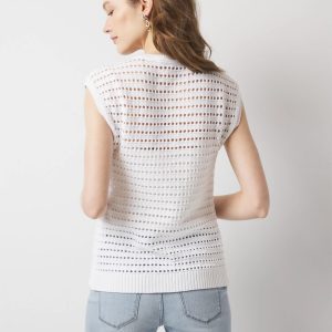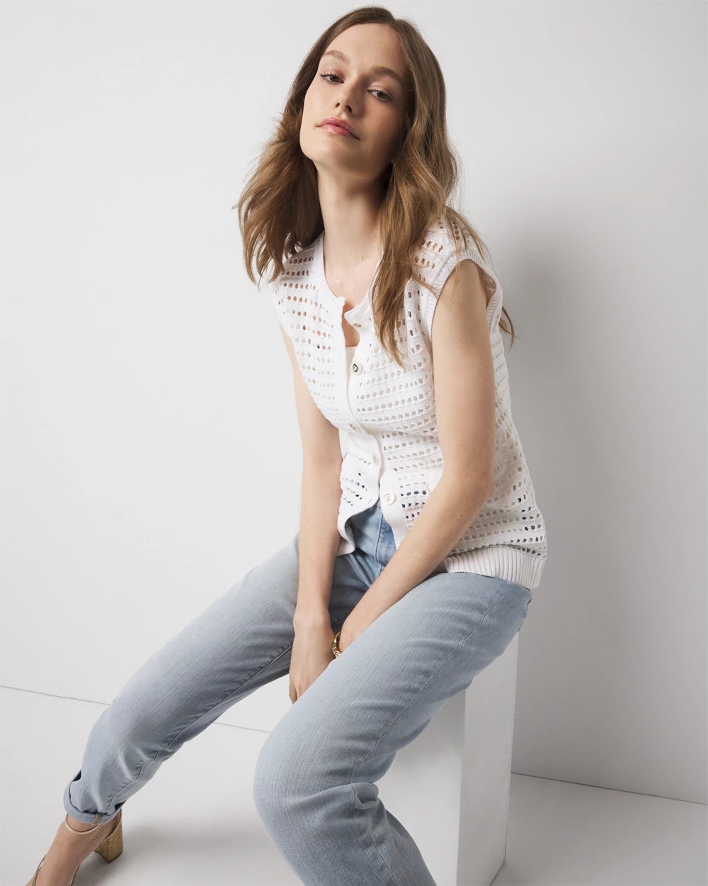 This open stitch cardigan vest is the ideal warm weather layer. It has front pockets and pretty buttons for closure. Wear it open or closed over your favorite tee or WHBM FORME™ top.