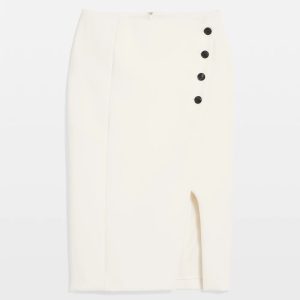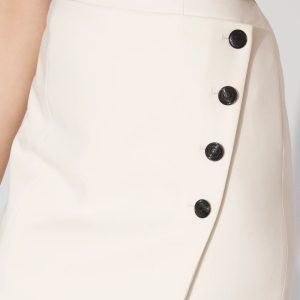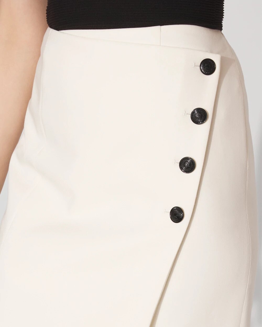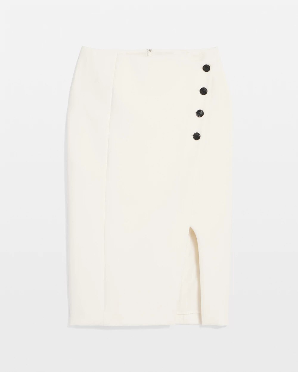 Crafted from your favorite luxe double weave fabric, this modern take of a classic pencil skirt has four functional buttons sewn onto an asymmetric front panel. We’ve added princess seams in back for a fabulous fit. Wear it with our matching Pocket Vest Halter Top.