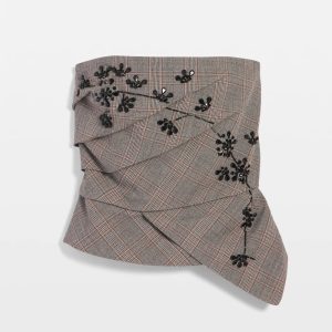 You love our bustiers for their sexy, feminine style. This latest version is made from a plaid fabric with a beaded floral embellishment that’s perfect for fall. The draping across the bodice and asymmetric hem gives you shape. Pair it with pants, jeans or a skirt.
