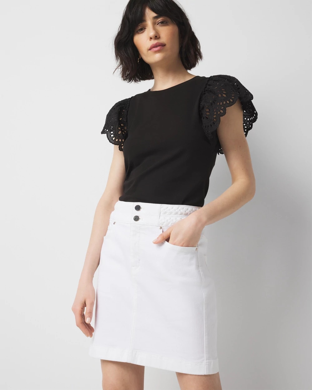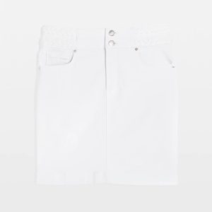 White denim is a summer must-have. We’ve elevated the look with the design of this miniskirt, adding double braided trim for a polished casual look. This A-line skirt has classic denim five pockets and double button and fly closure. A great look for weekend fun.