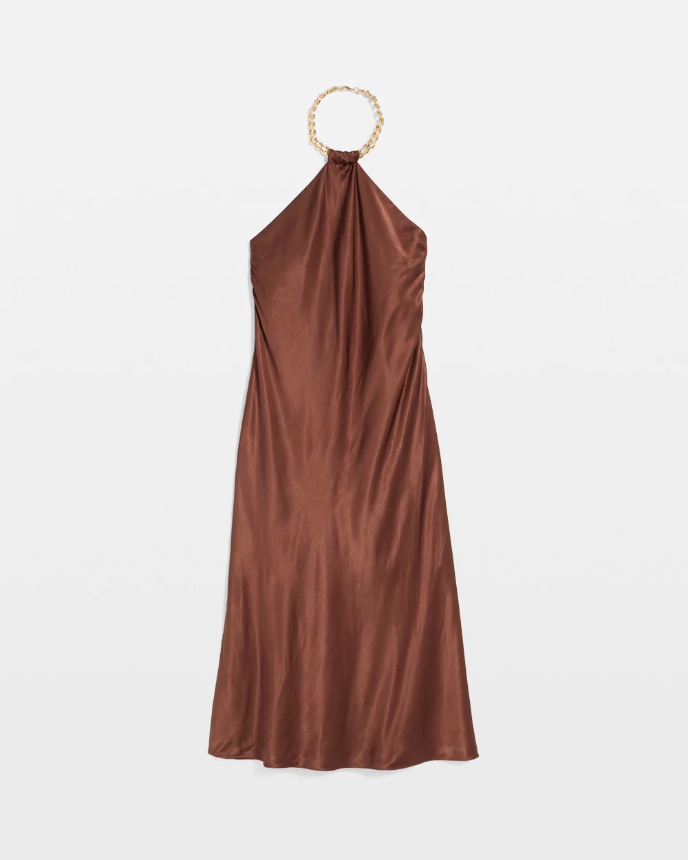A chunky chain with toggle closure creates the neckline on this satin slip halter dress, instantly elevating the look. An easy go-to dress for parties, just add heels.
