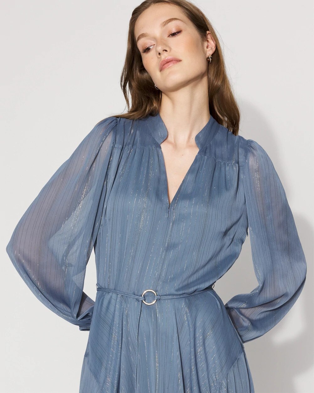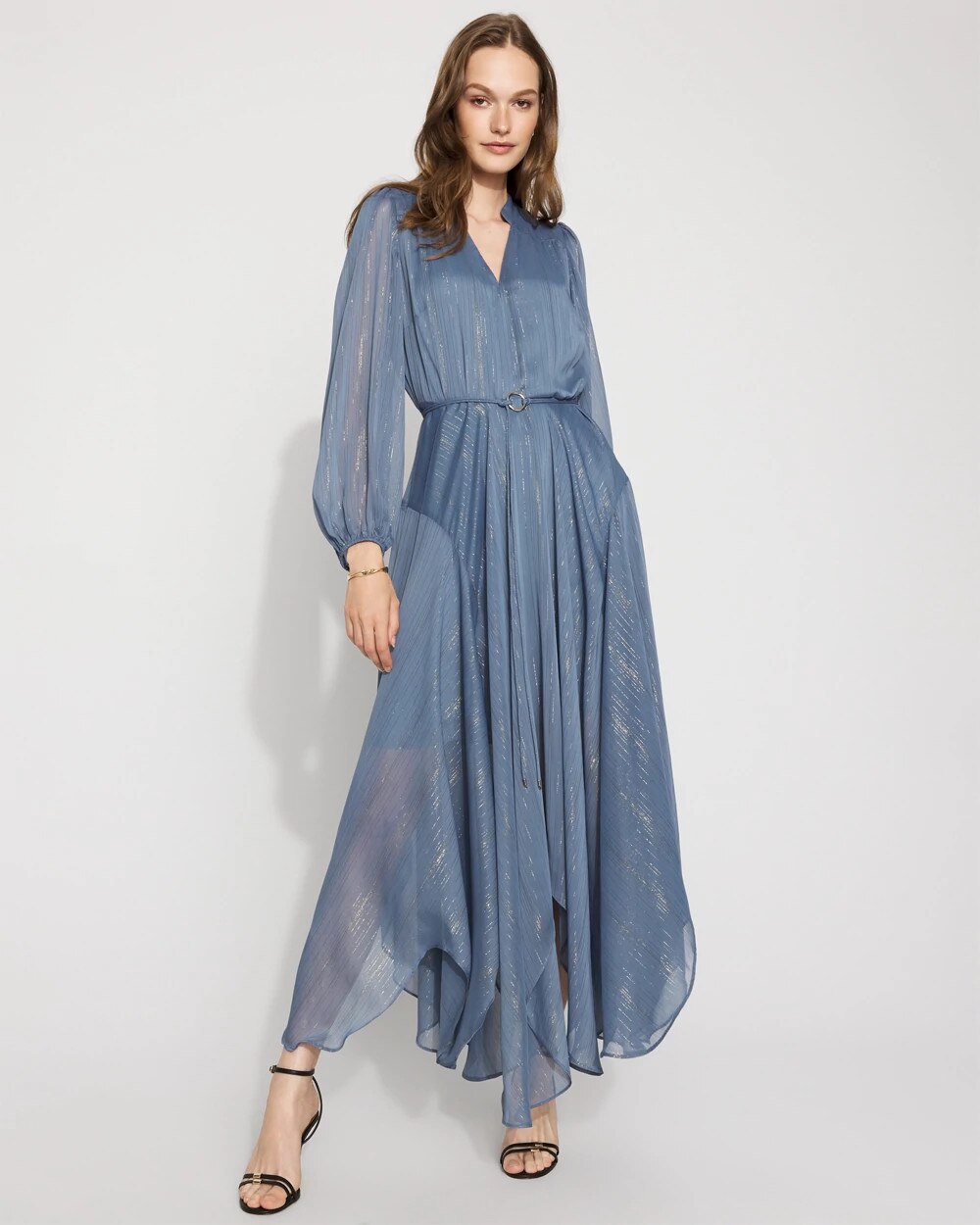 This chiffon maxi dress has a metallic variegated stripe for subtle shine and a handkerchief hem for a romantic, flowy look. We also designed it with a band collar, and a self-belt with a metal O-ring that is removable. Pair with strappy sandals or heels.
