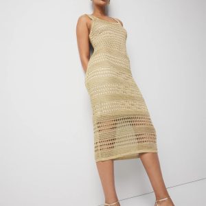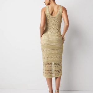 The open stitchwork on this tank dress adds a flirty + feminine vibe. Designed with an illusion lining to reveal bare skin below the knee and a scoop neckline. Metallic lurex throughout the yarn gives this sleeveless midi dress the perfect summer glow.