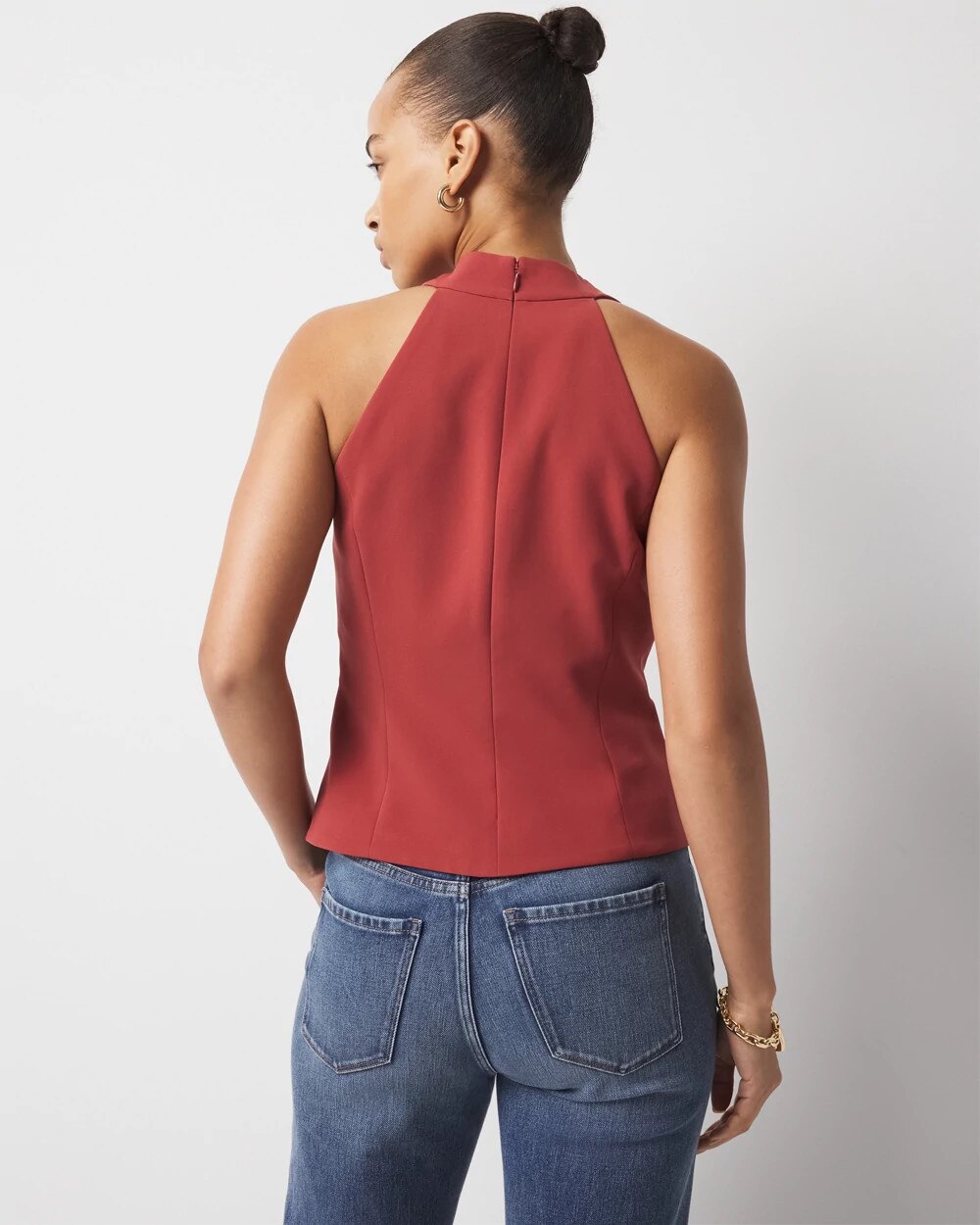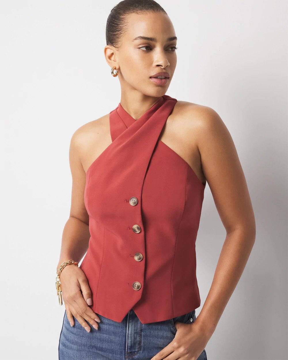 Business + pleasure is the theme of this halter top with inspo taken from classic menswear vests. Wear under a blazer by day, on its own by night.