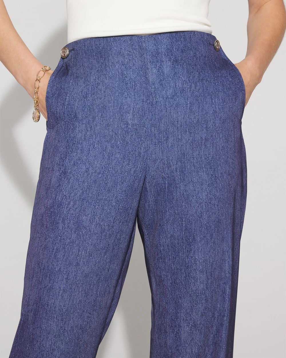 A lightweight fabric with a denim print gives these flowy trousers a fashion edge. Designed with a Hollywood waist and side zipper for a flattering look, the side slant pockets are adorned with crest buttons. Pair with our coordinating Denim Print Chiffon Halter Top.